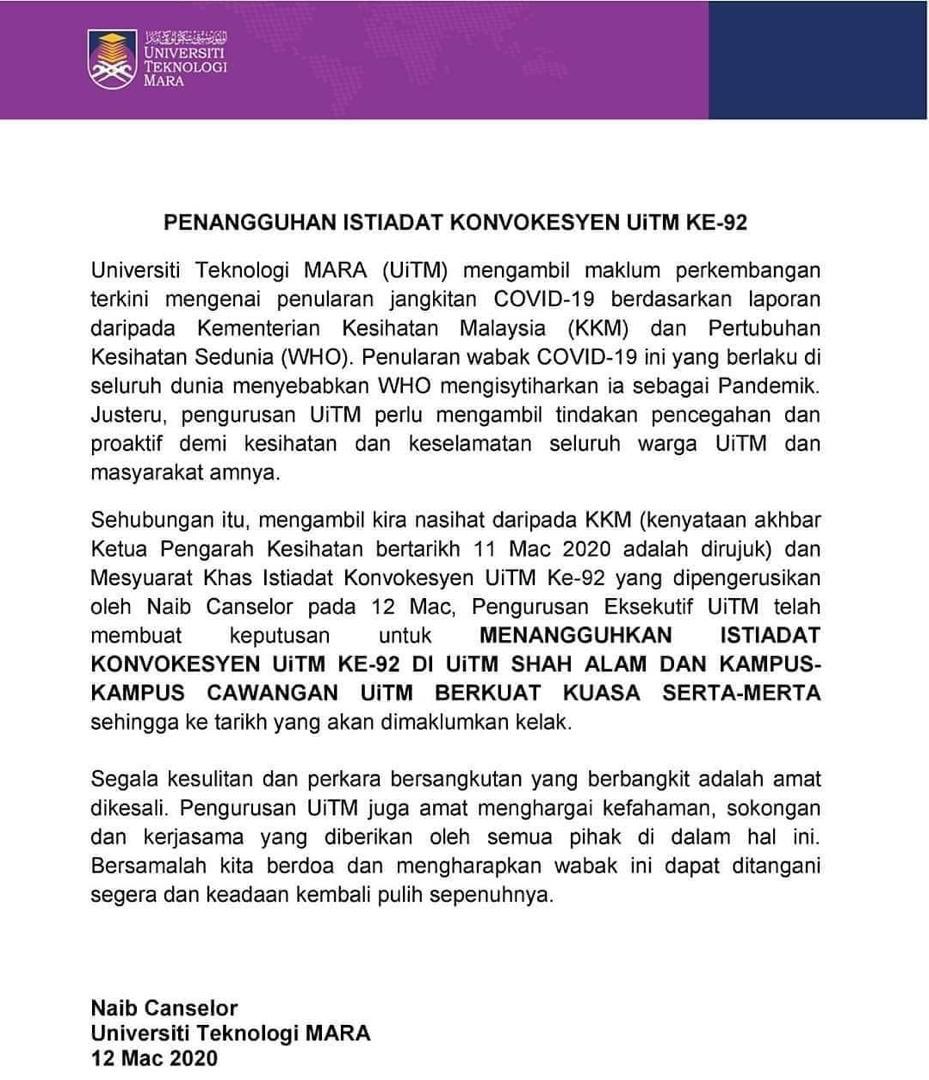 Uitm Official On Twitter Penangguhan Istiadat Konvokesyen Uitm Ke 92 Konvouitm92 Cegahcovid19 Kitauitm Uitmdihatiku Https T Co Npftq9ptrj Twitter